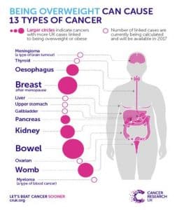 The leading cancers related to being overweight are breast cancer, ovarian cancer, colorectal cancer, pancreatic cancer, thyroid cancer, oesophage and stomach cancer, liver cancer, kidney cancer.